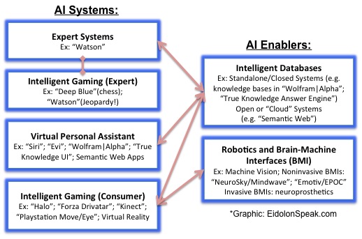 Advances that have enabled large-scale expert systems are now beginning to permeate into consumer devices, from virtual personal assistants (VPAs) on mobile devices that emphasize automatic speech recognition (ASR) and basic task learning and planning capabilities (e.g. Siri), to intelligent gaming systems and devices that monitor gamer movements and interface the gamer more optimally to the gaming system (e.g. Kinect, PlayStation Move/PlayStation Eye motion controllers). Gamers are already embracing machine vision devices that detect body motion and eye movement as an integral part of the gaming experience, and with brain-machine interface (BMI) technologies moving from science fiction to a possible reality, we can imagine actual human perception and thought fusion into virtual reality games (more on the infancy of BMIs in Part 4 of this series).