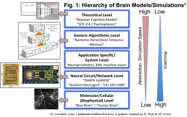 There have been many projects over the years seeking to simulate the neural structure of the biological brain (or to a lesser extent, a simpler biological nervous system or neural network) on either a traditional computing platform, or implemented in some form (analog, digital, or mixed analog/digital) on VLSI circuitry with hardware and/or software interfaces. "Computational neuroscience" generally applies to the former, and "neuromorphic engineering" generally applies to the latter. Brain simulation and modeling efforts can be broken into several levels: molecular/cellular scale, neural circuit/network scale, application specific/system scale, generic algorithmic scale, and at the highest level of abstraction, a theoretical scale – see Fig. 1.