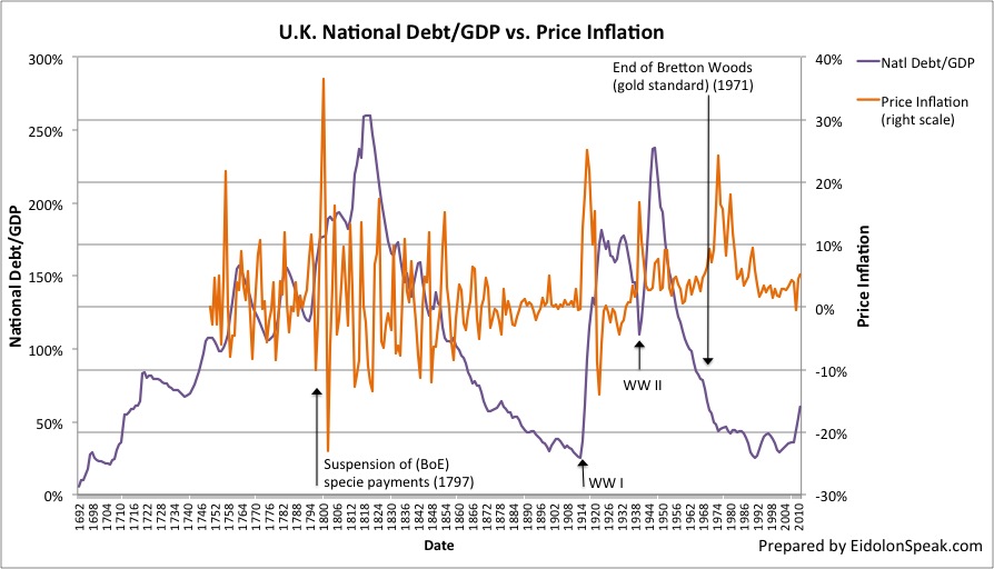 [Fig. 1] Data sources: U.K. National debt/GDP ; Historical UK Consumer Price Inflation, 1750-2009 – “Consumer Price Inflation Since 1750,” J. O’Donoghue, L. Goulding, G. Allen, 2004; Note that price inflation is the YoY change in the U.K. Retail Price Index (RPI) with numbers reported after 1947 HERE.