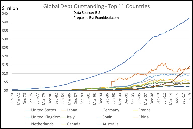 I recently updated this tally using mid-2019 data from the Bank of International Settlements (BIS), and the latest number stands at $126.5T, a 32%+ increase. U.S. debt outstanding is over 3x ($42.2T) the next highest debtor, now China, who surpassed Japan in the last two years. This follows significant growth in issuance of U.S. Treasury debt (funding an all-time high in the Federal public debt) and Corporate debt (fueling record levels in the corporate bond market), but also brisk growth in Mortgage and Household debt. China is dealing with its own issue of high debt levels amidst a slowing economy, and the Eurozone is struggling with wildly unpopular negative rates that do little to spur weak economies.