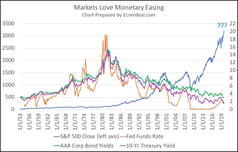 I’ve primarily written about the hazards of cheap money and monetary easing, here and elsewhere. Admittedly, it is hard to convince many of the hazards when the markets (stock and bond) have a record decade, as they have had from 2010-2019. Markets love monetary easing (chart below). The hazards: risk asset price inflation that puts markets into overvalued territory for significant periods of time, placing volatility risk and interest rate risk into greater territory. One only has to look at the monetary easing love chart to see this volatility in the stock markets when the Fed signaled tapering its asset purchases (2013), or actually started tightening (2016 with the FFR and again in 2018 with the balance sheet). The markets and rates become volatile when the Fed does not provide a continuous backstop.