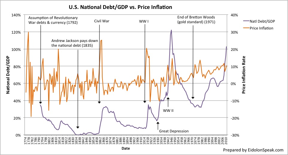 [Fig. 1] Data sources: U.K. National debt/GDP ; Historical UK Consumer Price Inflation, 1750-2009 – “Consumer Price Inflation Since 1750,” J. O’Donoghue, L. Goulding, G. Allen, 2004; Note that price inflation is the YoY change in the U.K. Retail Price Index (RPI) with numbers reported after 1947 HERE.
