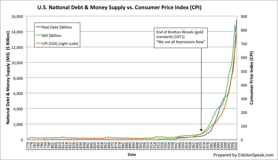 [Fig. 3] Data sources: National debt and CPI (SGS) data from the same sources as Fig. 2; M3 money supply is taken from both Federal Reserve data up to 2006 (when the Fed discontinued providing it) and external sources (NowandFutures.com ) which still calculate it based on the same formula.